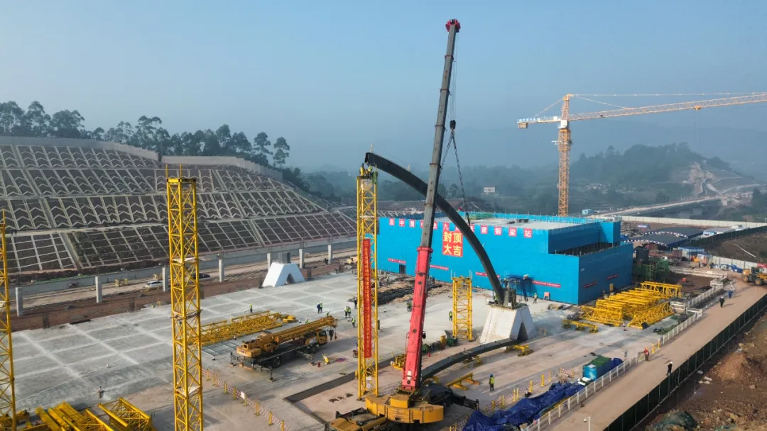 近日,随着新建成渝中线高铁铜梁站钢结构网架首拱顺利吊装就位,标志着项目进入钢结构施工关键阶段。