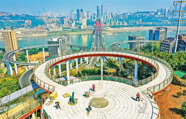 3月7日,南岸区苏家坝步道观景平台施工现场,观景平台和步道主体已完工,工人正加紧绿化和装饰收尾工作。
