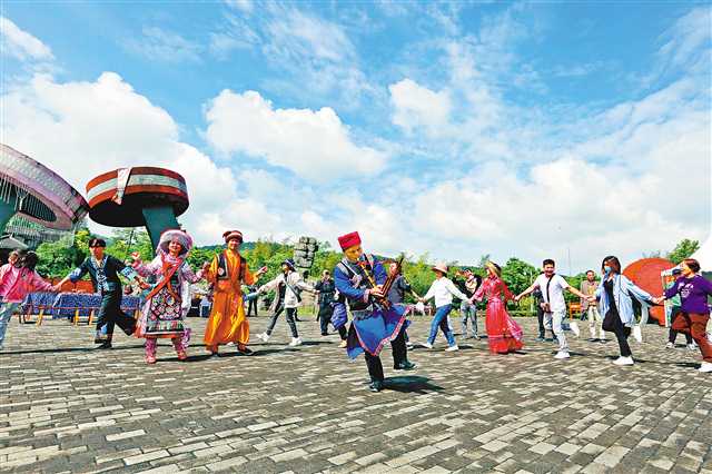 5月2日,万盛石林景区,苗族阿哥阿妹与游客一起跳舞。“五一”假期,该景区开展文化展演活动,通过竹竿舞、团结舞等民俗文化展演,为游客打造沉浸式民俗文化体验。