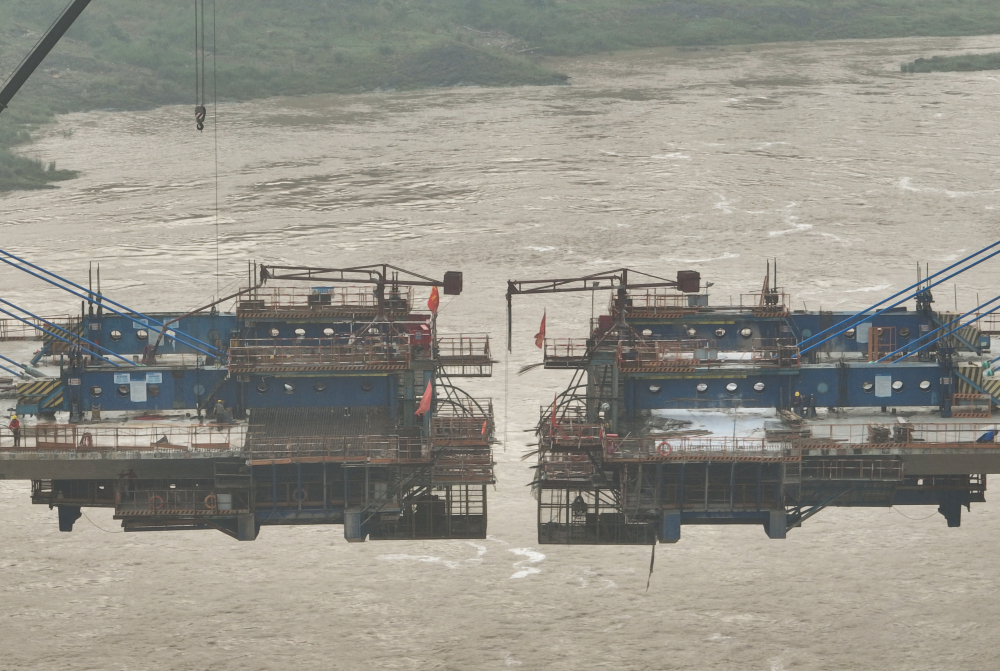 10月8日,合川区渝武高速复线草街嘉陵江特大桥施工现场,中交一公局的工人正在桥面施工作业。该大桥是重庆渝武高速公路复线控制性工程,预计将于11月合龙。
