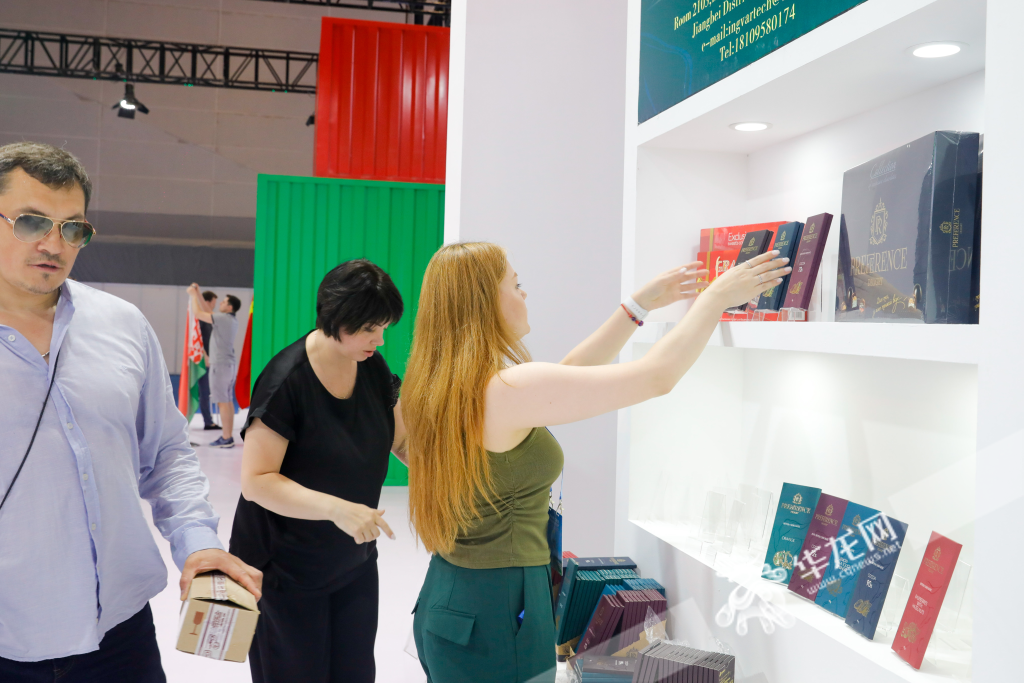 在重庆馆旁边,是本届西洽会主宾国白俄罗斯的展馆,记者在现场看到,在各个柜台上,陈列着白俄罗斯的各式特色食品。