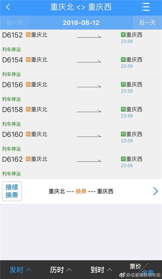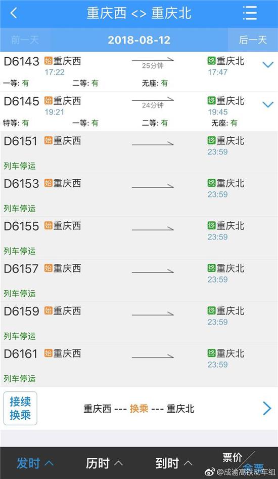 @成渝高铁动车组消息,8月12日,重庆北和重庆西的区间列车共12趟班次停运,D6143、D6145次继续开行。