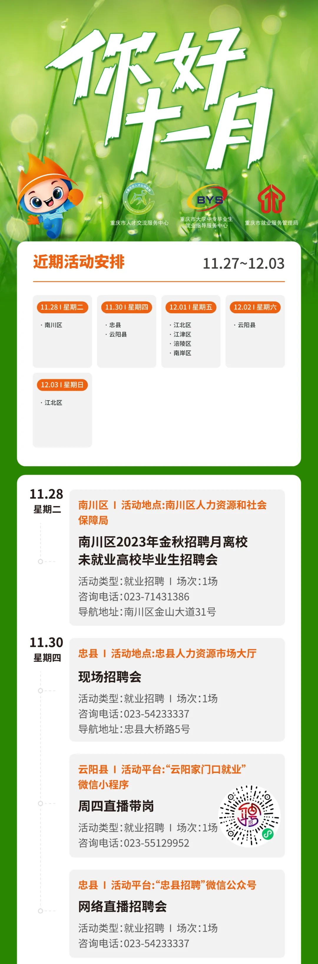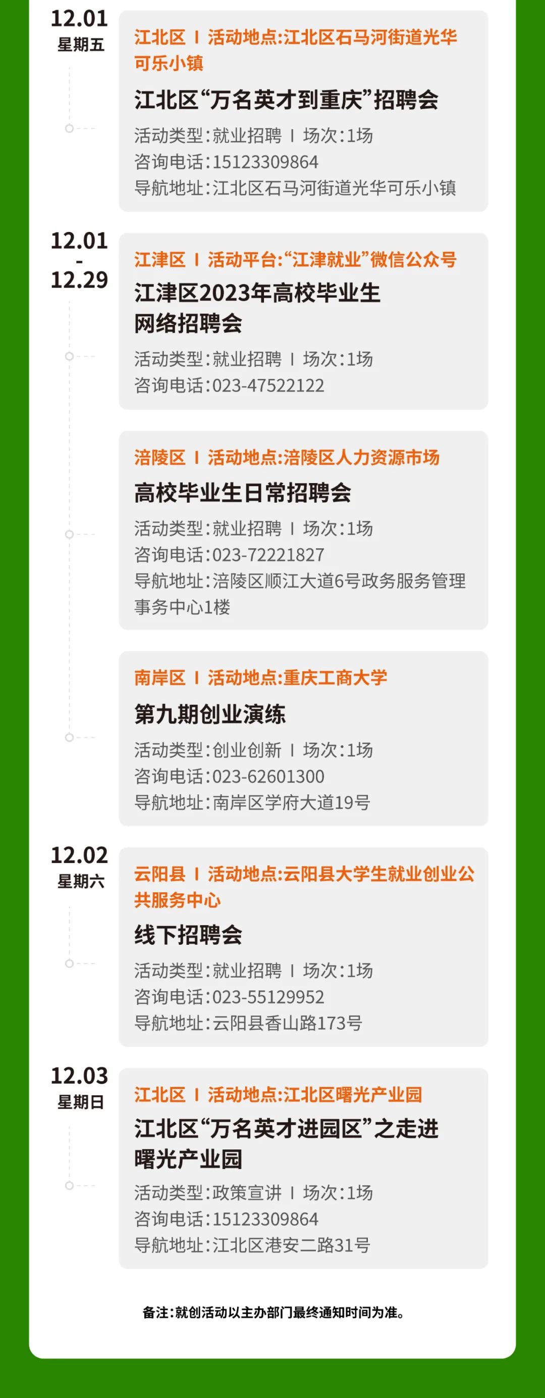 共10场大学生就业创业活动。其中,包括2023年金秋招聘月离校未就业高校毕业生招聘会、“万名英才到重庆”招聘会、创业演练等活动,期待你的参与!