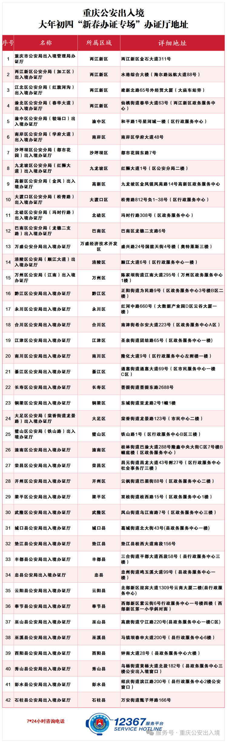 重庆市公安局出入境管理局温馨提醒:放假期间,请广大市民合理安排办证和取证时间,以免耽误行程。如遇紧急特殊情况需办理因私出国(境)证件的,可拨打重庆市公安局出入境管理局24小时咨询服务热线(023)12367。