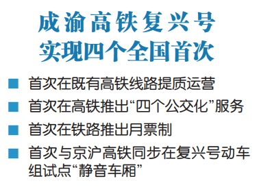 除了速度提升,成渝高铁还推出了“四个公交化”(产品公交化、购票公交化、乘车公交化、服务公交化),实施成渝提质品牌战略。未来,“公交化”的成渝高铁将承担起“城际大公交”的历史使命,让成渝双城真正融为“一小时生活圈”。