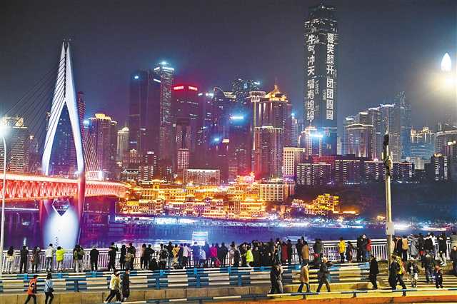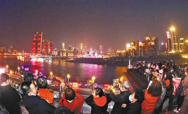 山城夜景是重庆的名片,夜游更是重庆旅游的特色。春节假期,不少市民和游客走上街头、来到江边,赏新春灯饰、逛山城夜景,感受不一样的城市风貌。图为2月16日,市民正在北滨路欣赏灯光璀璨的山城夜景。首席记者 龙帆 摄/视觉重庆
