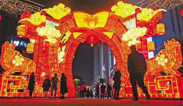 2月16日,北碚区嘉陵风情步行街,市民们从灯饰拱门下走过。记者 万难 摄/视觉重庆
