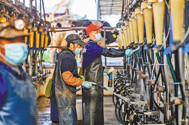 2月12日,大年初一,荣昌区远觉镇狮子桥村奶牛养殖基地,工人正在挤奶厅忙碌。首席记者 龙帆 摄/视觉重庆