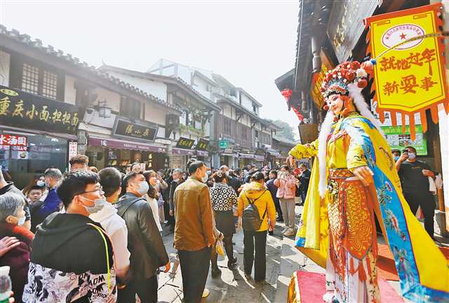2月14日,沙坪坝区磁器口,一戏曲演员正为游客表演传统川剧。特约摄影 钟志兵/视觉重庆