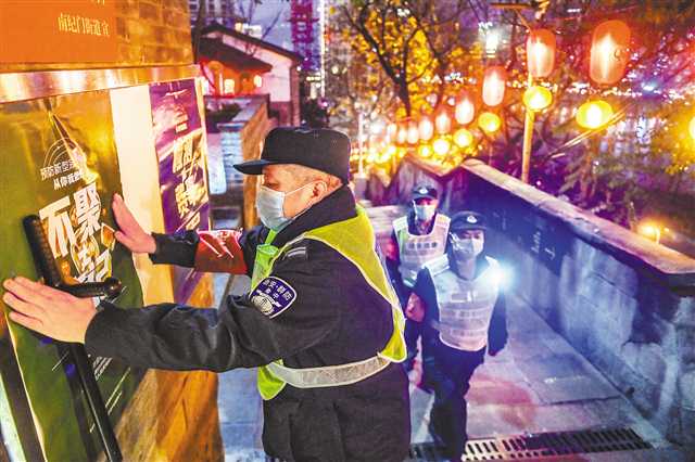 2月15日晚,渝中区山城巷,治安巡逻人员正在街巷巡逻。首席记者 龙帆 摄/视觉重庆