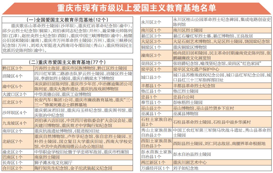 为深入贯彻落实习近平总书记“七一”重要讲话精神,进一步丰富拓展我市爱国主义教育资源,10月15日,市委、市政府命名重庆大轰炸遗址等21个单位为重庆市爱国主义教育基地。此次命名后,我市市级以上爱国主义教育基地达89个。其中,全国爱国主义教育示范基地有12个,市级爱国主义教育基地有77个。(具体名单附后)