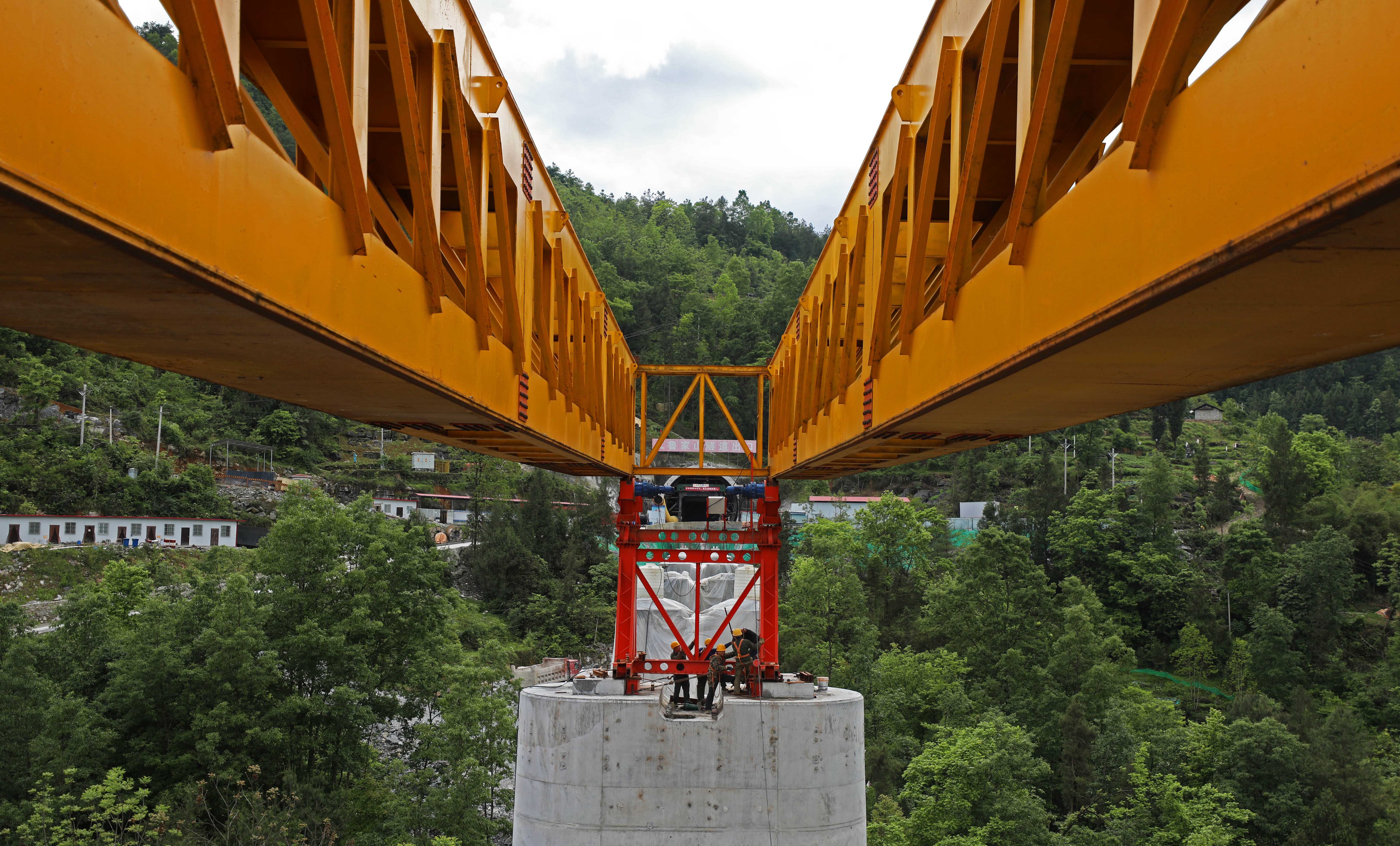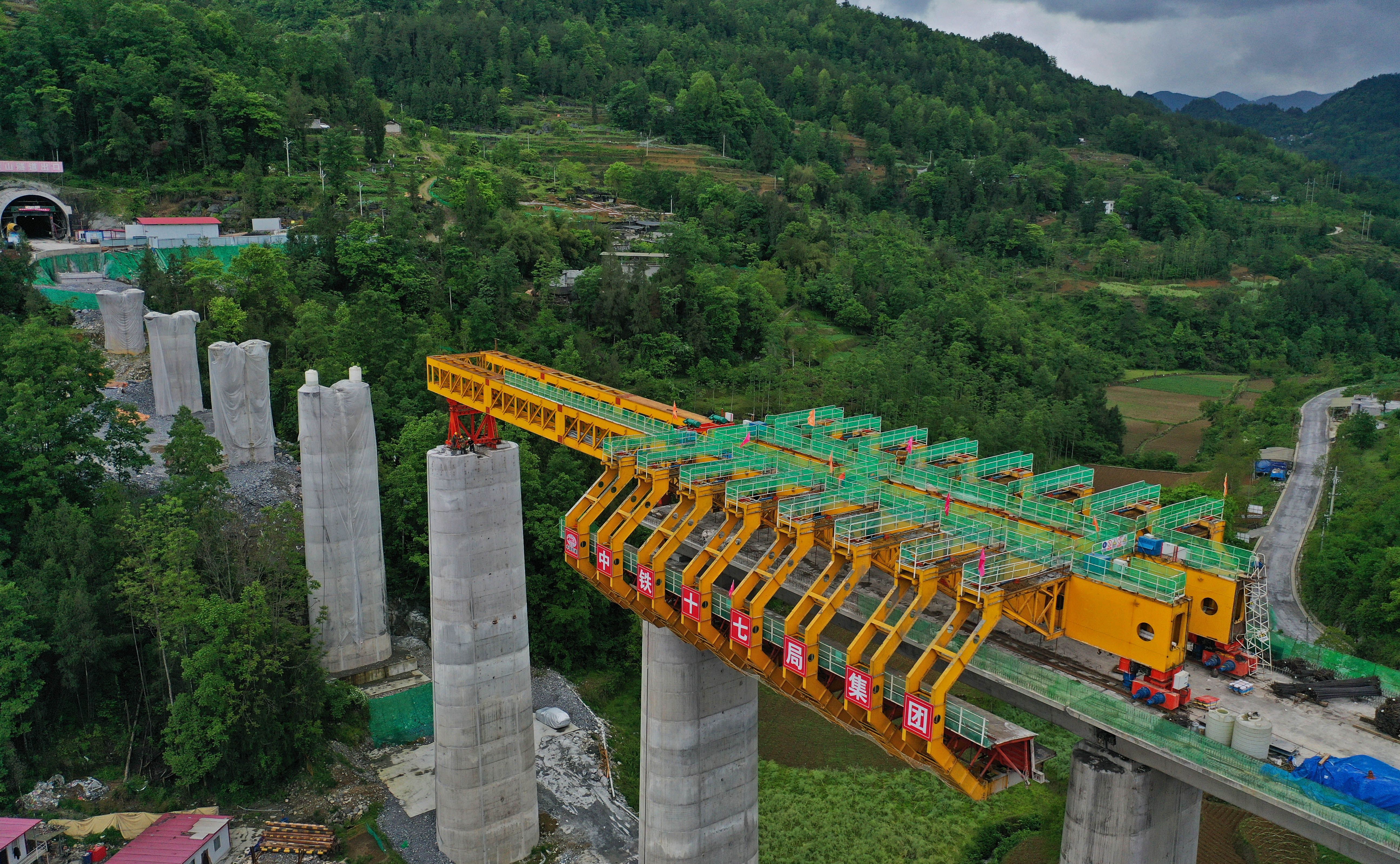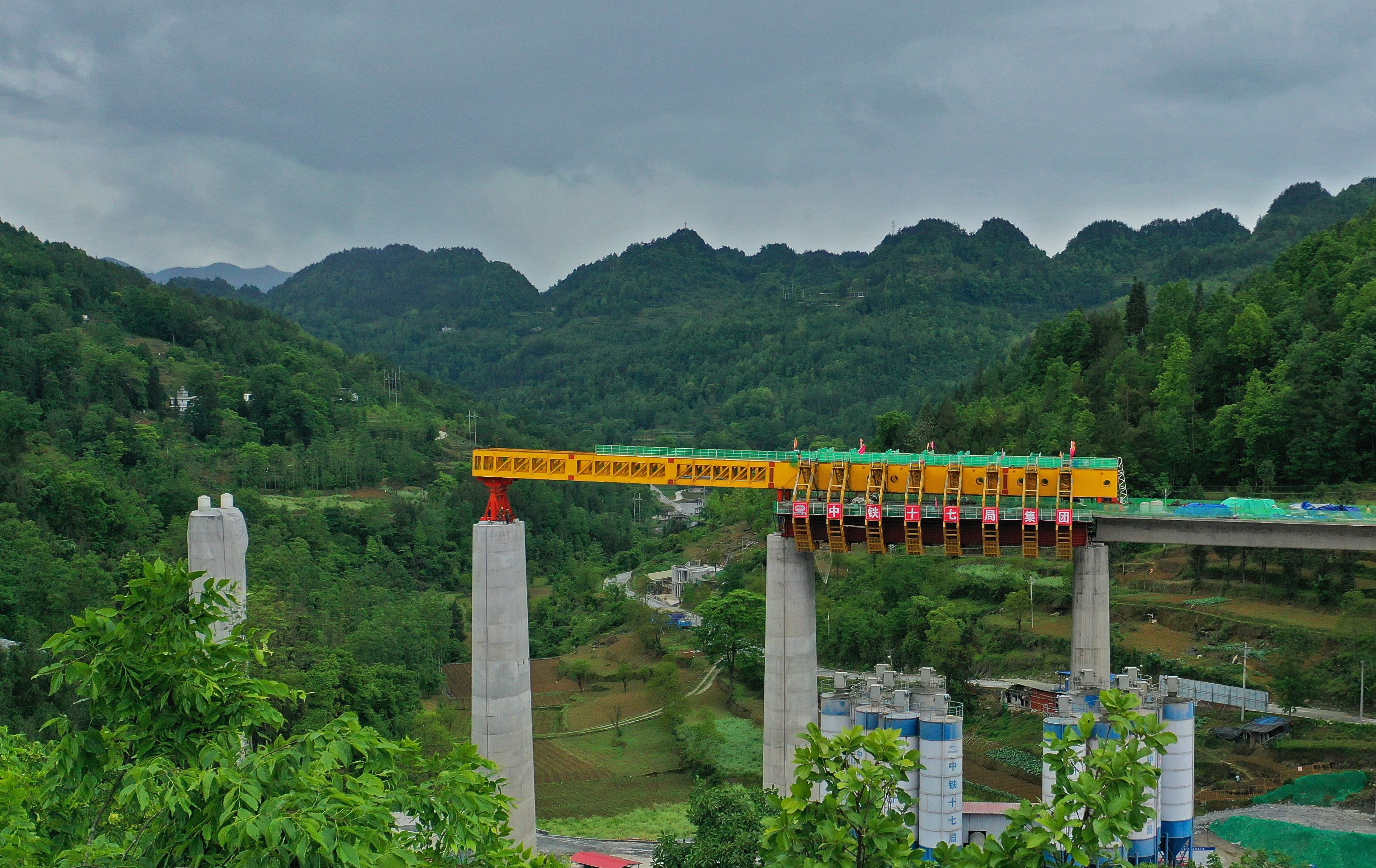 5月1日,彭水保家镇团堡村,渝湘高铁生基坪双线特大桥正在进行移动模架过孔作业。