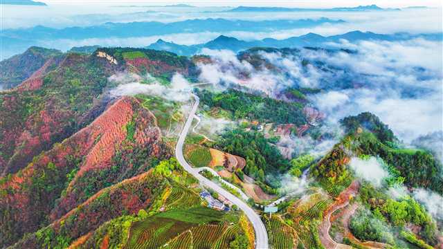 图为10月22日,万盛经开区丛林镇白龙村,云雾缭绕山乡,新修的道路、农田与层林尽染的青山相映成趣,美不胜收。