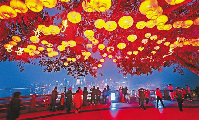 南岸区一棵树观景台,大红灯笼把这里装扮得喜气洋洋。特约摄影 钟志兵/视觉重庆