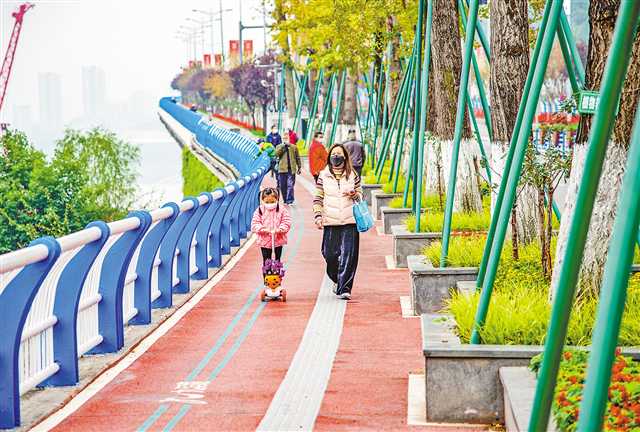 九滨路上,市民在人行道休闲散步。近年来,九龙坡区对一批主要道路的人行道实施“畅通、安全、舒适、美化”工程,大幅改善了市民的出行环境。记者 郑宇 摄/视觉重庆