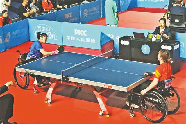 图为重庆队的陈洪(左)在乒乓球女子团体TT1-2级决赛中。(市残联供图)