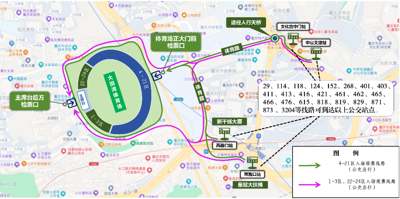 前往4-21看台区:公交车站→大田湾体育场正大门检票口;