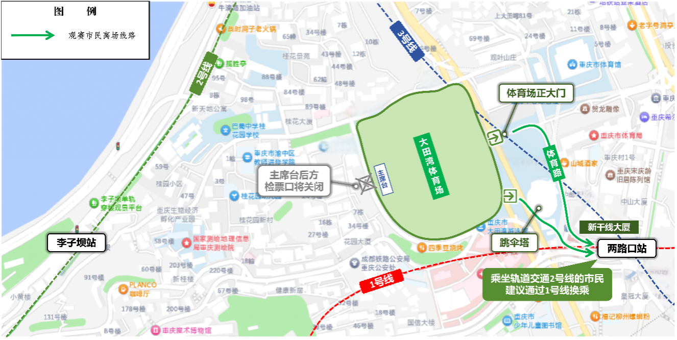方案2:乘2号线李子坝站→3号口出站→步行约800米(10分钟)→桂花园路→体育路→主席台后方检票口。