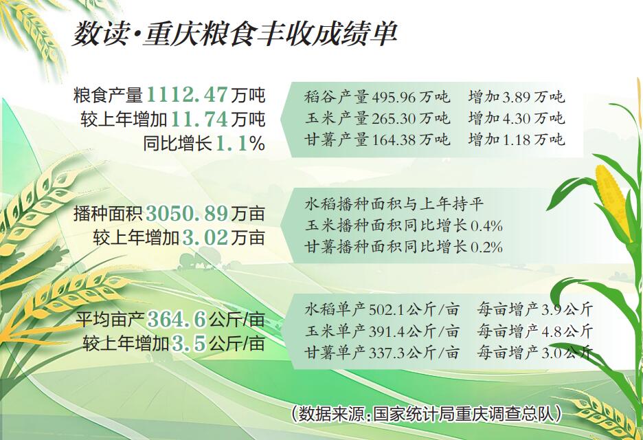 近日,国家统计局重庆调查总队公布数据显示:2025年我市粮食播种面积3050.89万亩,同比增长0.1%;产量1112.47万吨,同比增长1.1%;亩产364.6公斤,同比增长1.0%。其中,粮食总产量创20年来新高。