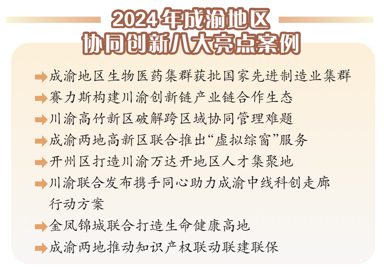 2024年成渝地区协同创新八大亮点案例当天发布,涵盖先进制造业集群共建、创新链产业链合作生态打造、知识产权联动联建联保等方面。