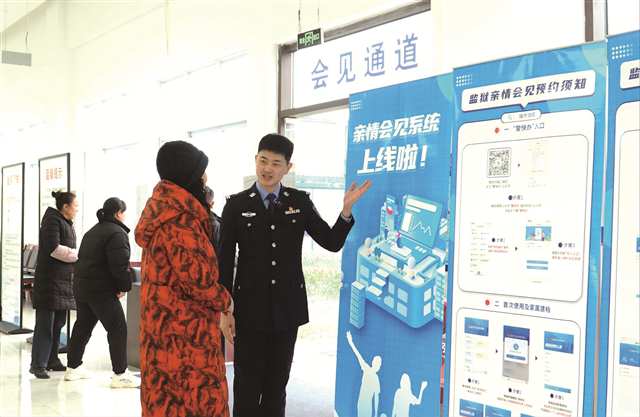 监狱民警为服刑人员家属介绍亲情会见系统上线服务