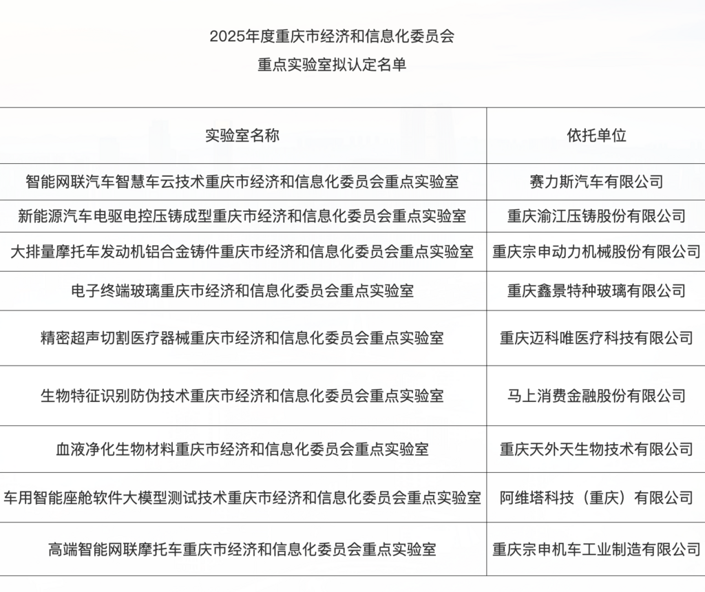 1月23日,重庆市经济信息委发布消息,在企业自愿申报的基础上,经相关工作程序,拟认定赛力斯汽车有限公司等9家依托单位所建的重点实验室为2025年度重庆市经济和信息化委员会重点实验室。