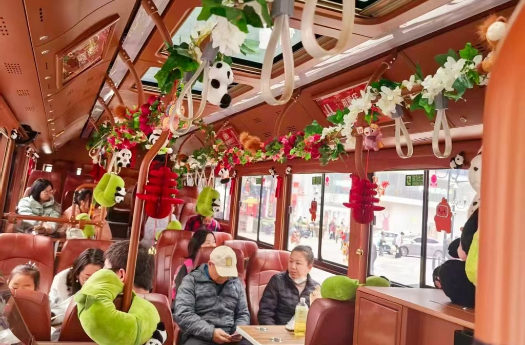 此次新增6辆车后,“熊猫巴士”运力得到显著提升,并同步完成“换装”升级:车身与内饰进一步强化了熊猫主题装饰,从外观彩绘、窗花,到车内熊猫玩偶摆件、贴画,处处透着萌趣与喜庆。