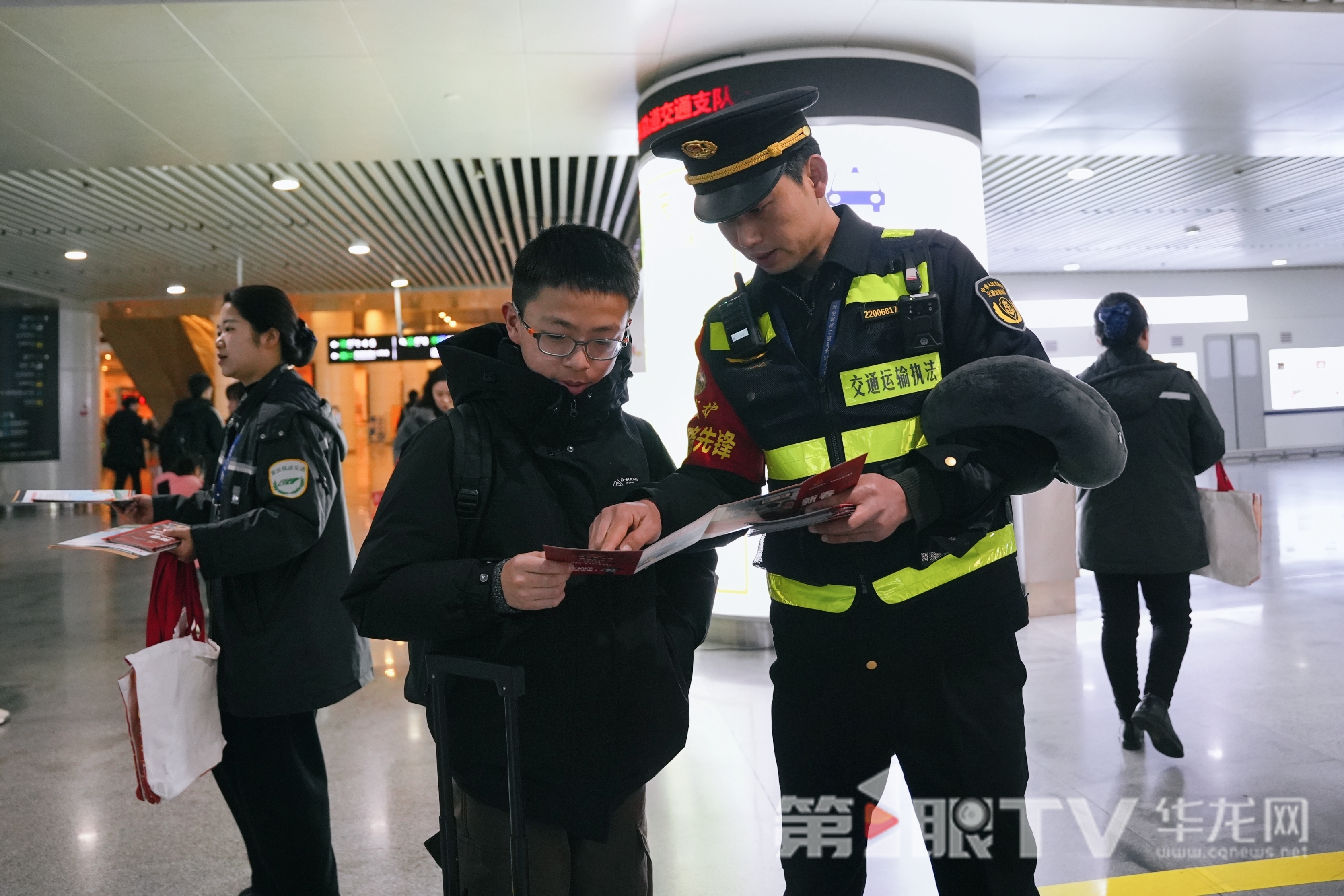 执法人员帮助携带大件行李的乘客搬运行李。第1眼TV-华龙网记者 辛飞 摄