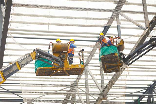 2月17日,梁平无人驾驶飞行器制造产业园项目建设现场,工人借助登高车在厂房钢结构内铺挂安全网兜。春节期间,有300多名建设者在此坚守岗位,确保3月31日第一批厂房交付。特约摄影 刘辉/视觉重庆