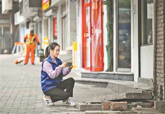 沙坪坝区的网格员正将街道地下沟渠盖板移位问题上传系统。记者 罗斌 摄/视觉重庆
