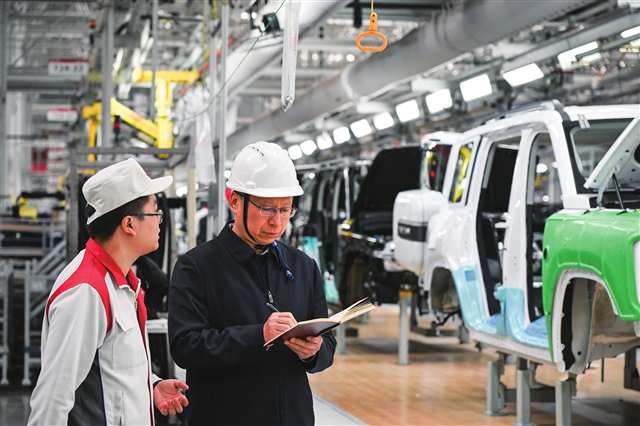 全国人大代表、中国船舶集团首席技师傅国涛(右)在企业调研