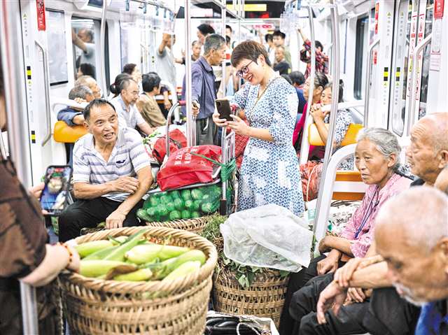 重庆轨道交通4号线上,菜农们背着装满蔬菜水果的背篓进城售卖。这条线路被大家亲切地称为“背篓专线”。