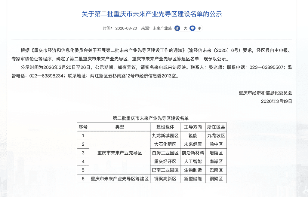 3月20日,重庆市经济信息委公示了“第二批重庆市未来产业先导区建设名单”。其中,重庆市未来产业先导区5个,重庆市未来产业先导区筹建区1个。