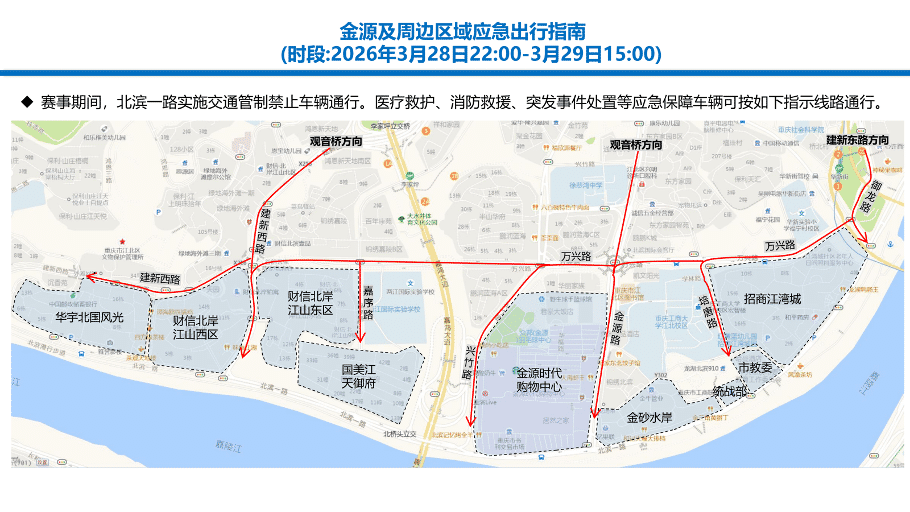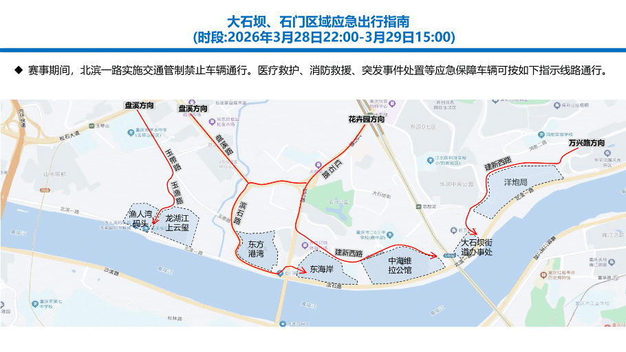 赛事期间,北滨一路实施交通管制禁止车辆通行。医疗救护、消防救援、突发事件处置等应急保障车辆可按如下指示线路通行。