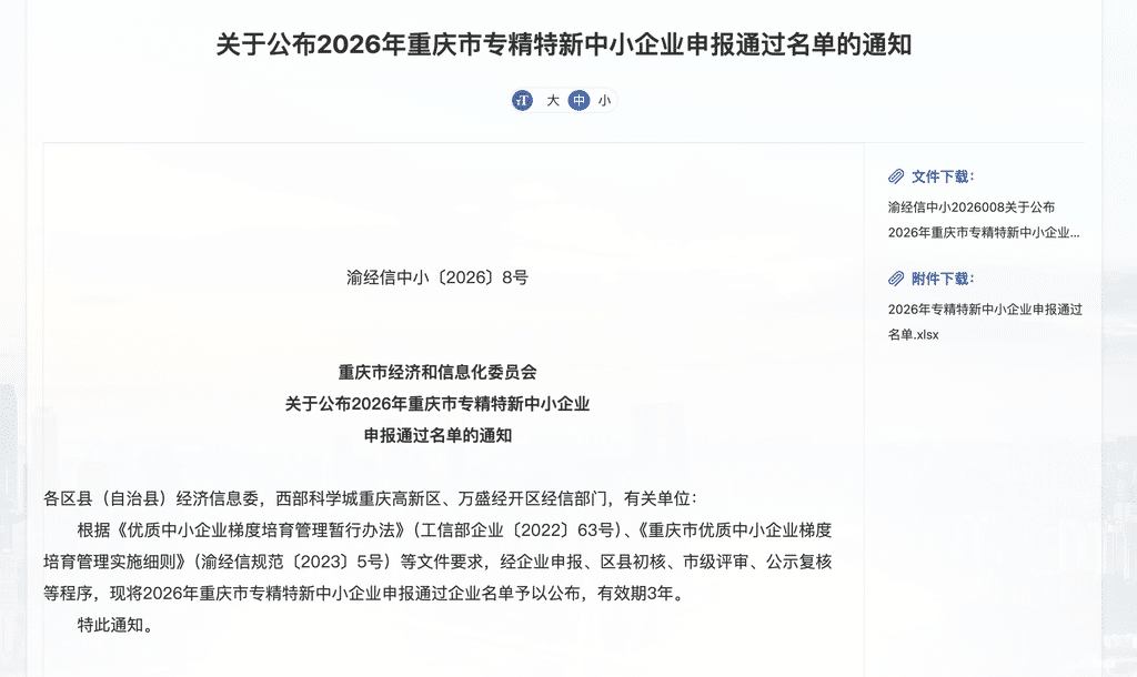 日前,重庆市经济信息委公布“2026年重庆市专精特新中小企业申报通过名单”,共有1023家,有效期3年。