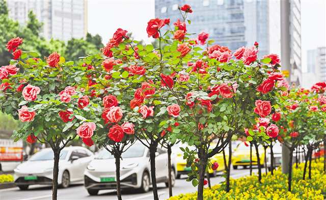 4月的重庆街头,因首轮盛放的树状月季而格外亮眼。从两江新区兴盛大道、建新北路到海尔路,主干道两侧花团锦簇;北滨一路、二路绵延数公里的花带沿崖岸生长;沙坪坝区沙滨路、天梨路、凤中路等多条主干道也迎来树状月季盛花期。繁花满枝、色彩艳丽,为重庆街头披上美丽春装。