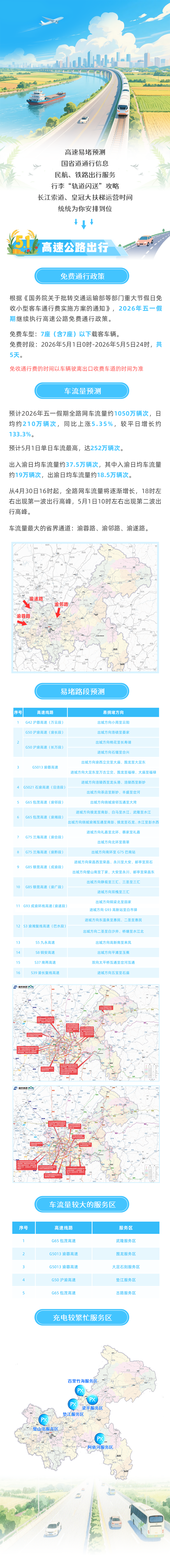 预计5月1日单日车流最高,达252万辆次,出入渝日均车流量约37.5万辆次,其中入渝日均车流量约19万辆次,出渝日均车流量约18.5万辆次。