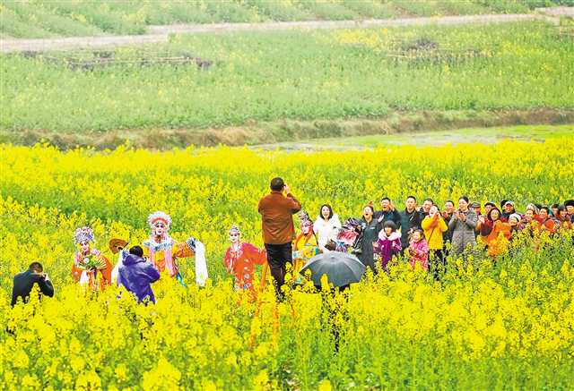 忠县3月2日,忠县马灌镇万亩油菜花田,京剧爱好者身着戏服拍照,一边吟唱《贵妃醉酒》,一边翩翩起舞,赢得当地村民阵阵掌声。通讯员余鸿摄