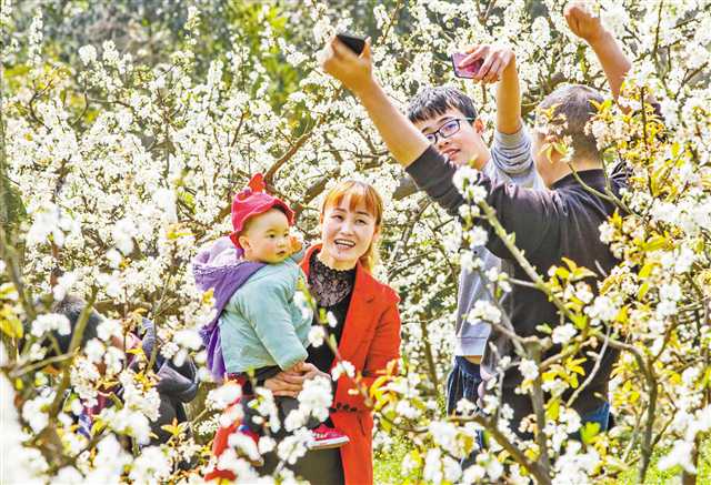璧山3月3日,璧泉街道虎峰社区,成片的李花迎春绽放,不少市民前来合影留念。特约摄影谢捷