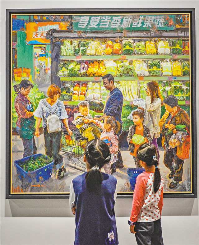 9月22日,四川美术学院美术馆,两位小朋友停留在一幅油画作品前仔细欣赏。