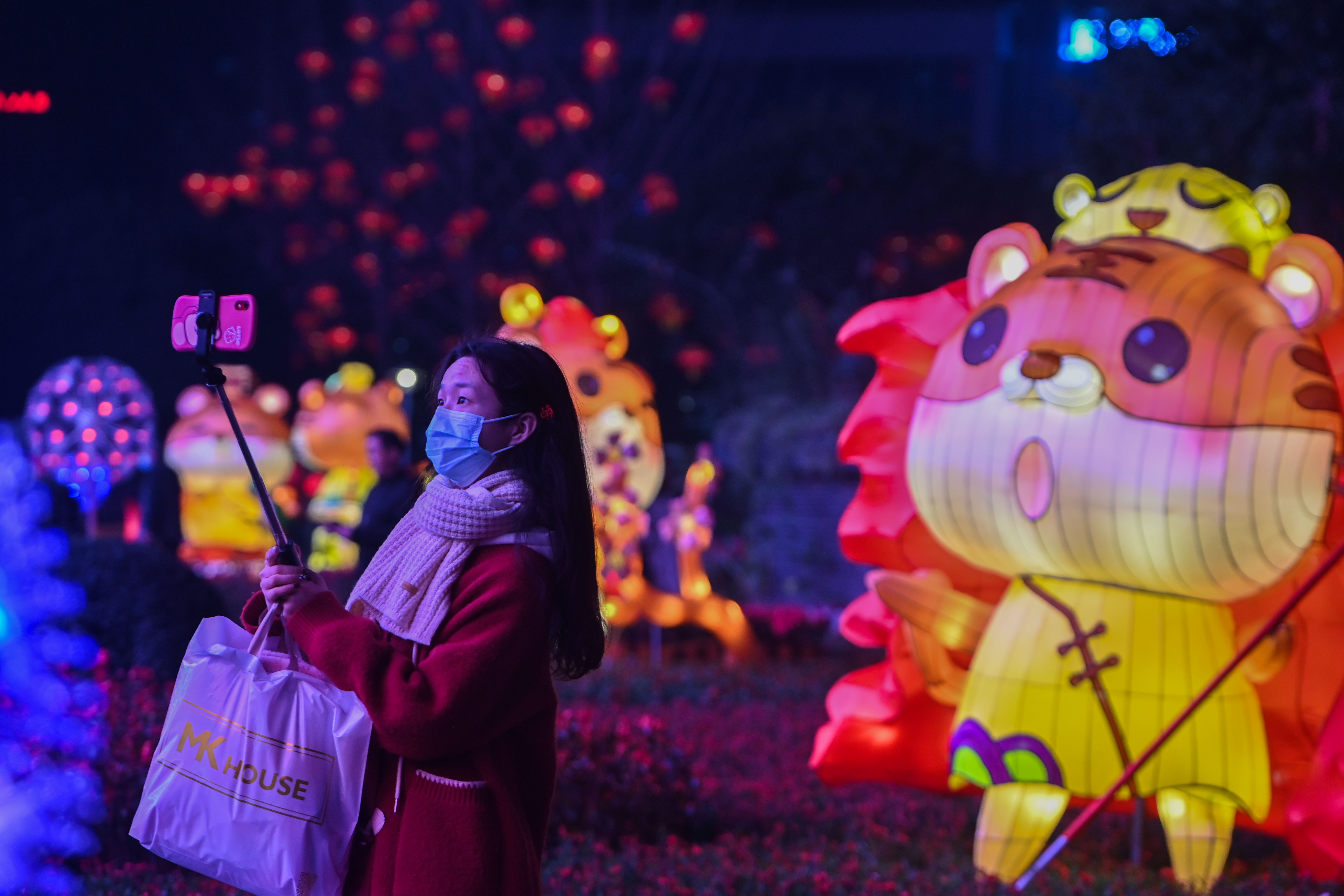 ▲1月17日,江北区观音桥商圈,市民正在迎春灯饰前拍照留影。