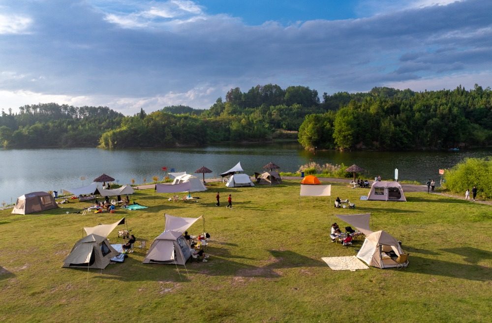 秋日的黎香湖镇湿地生态园内,粉黛乱子草迎来盛花期,大片粉红色的花海如梦如幻,成为游客们拍照留念的打卡胜地。露营区大片的绿色草坪上,各式帐篷星罗棋布,游客们在此享受大自然的宁静与惬意。