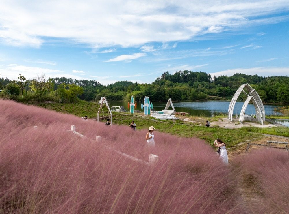 10月7日,南川区黎香湖镇湿地生态园,粉黛乱子草烂漫盛放,吸引不少游客前来打卡游玩,尽享秋日浪漫。特约摄影 罗川