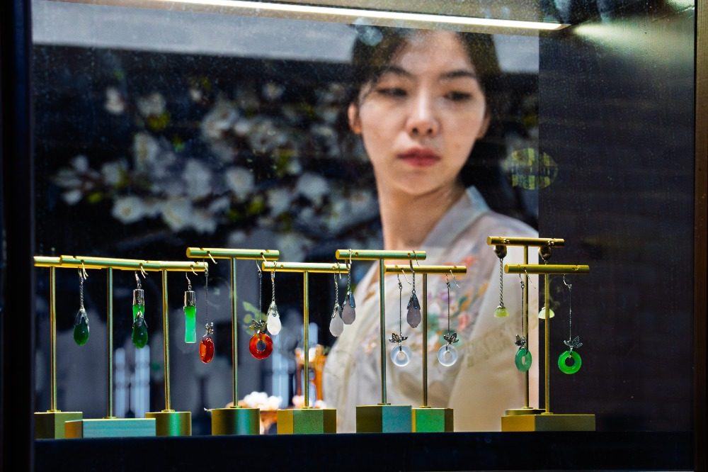 10月11日,渝中区十八梯传统风貌区,游客在店铺里选购饰品。记者 李雨恒 摄