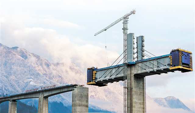 在山谷里修建这么高的桥墩,可不是一件容易的事。