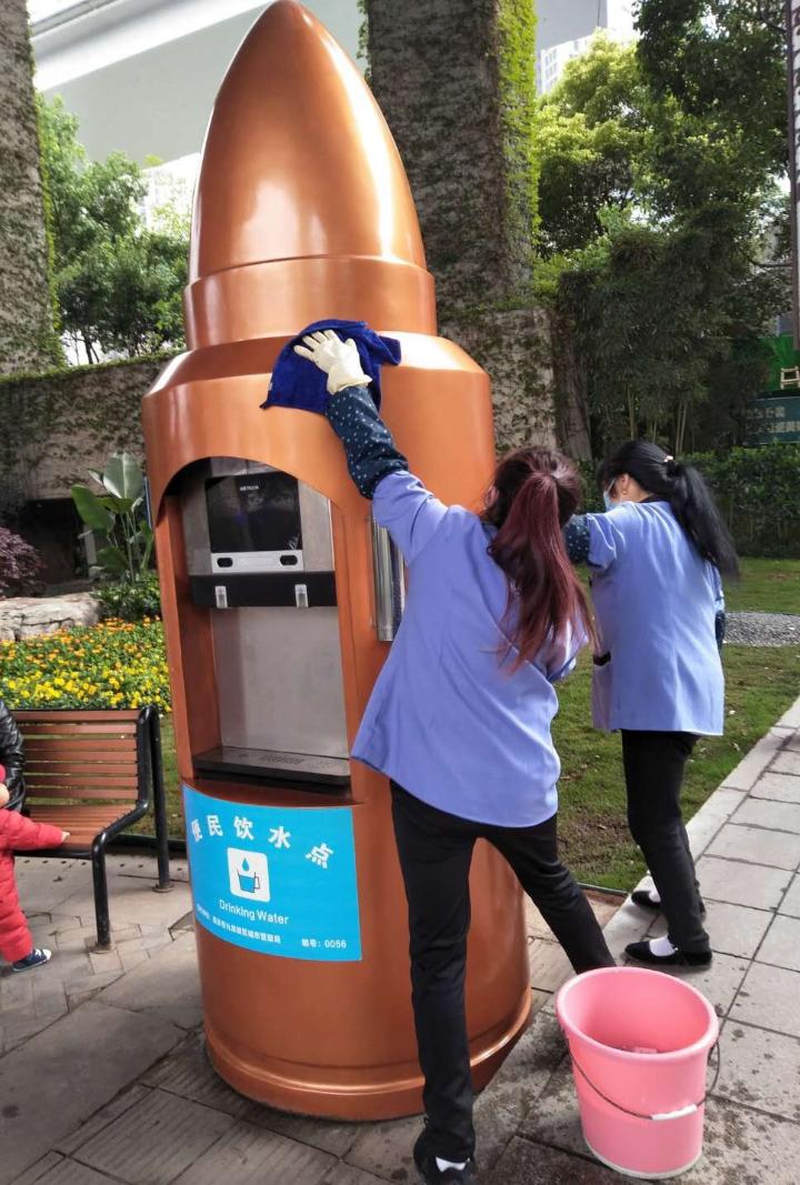 恢复直饮水设施的包括主城各社区、街道以及各大商圈等。九龙坡区全区有56处直饮水点,主要分布在石桥铺、杨家坪等商圈和景区,目前已有35台设备恢复投用。为让市民喝上放心水,九龙坡区的城市管理人员每两天对直饮水内机进行一次消毒,每天还有专人对外亭进行消毒。