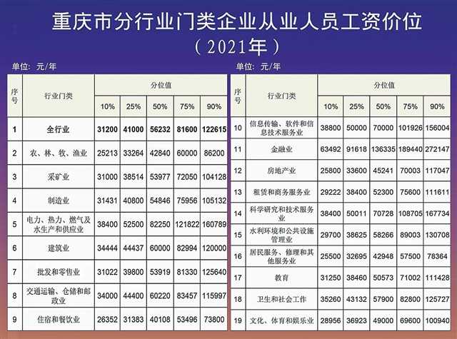 近日,市人力资源和社会保障局发布《重庆市2021年人力资源市场工资价位和企业人工成本信息》。数据显示,重庆市企业2021年工资报酬中位数为56232元/年,与上年相比增长4.66%,与重庆市2021年地区生产总值同比增长8.30%的经济运行态势基本一致。