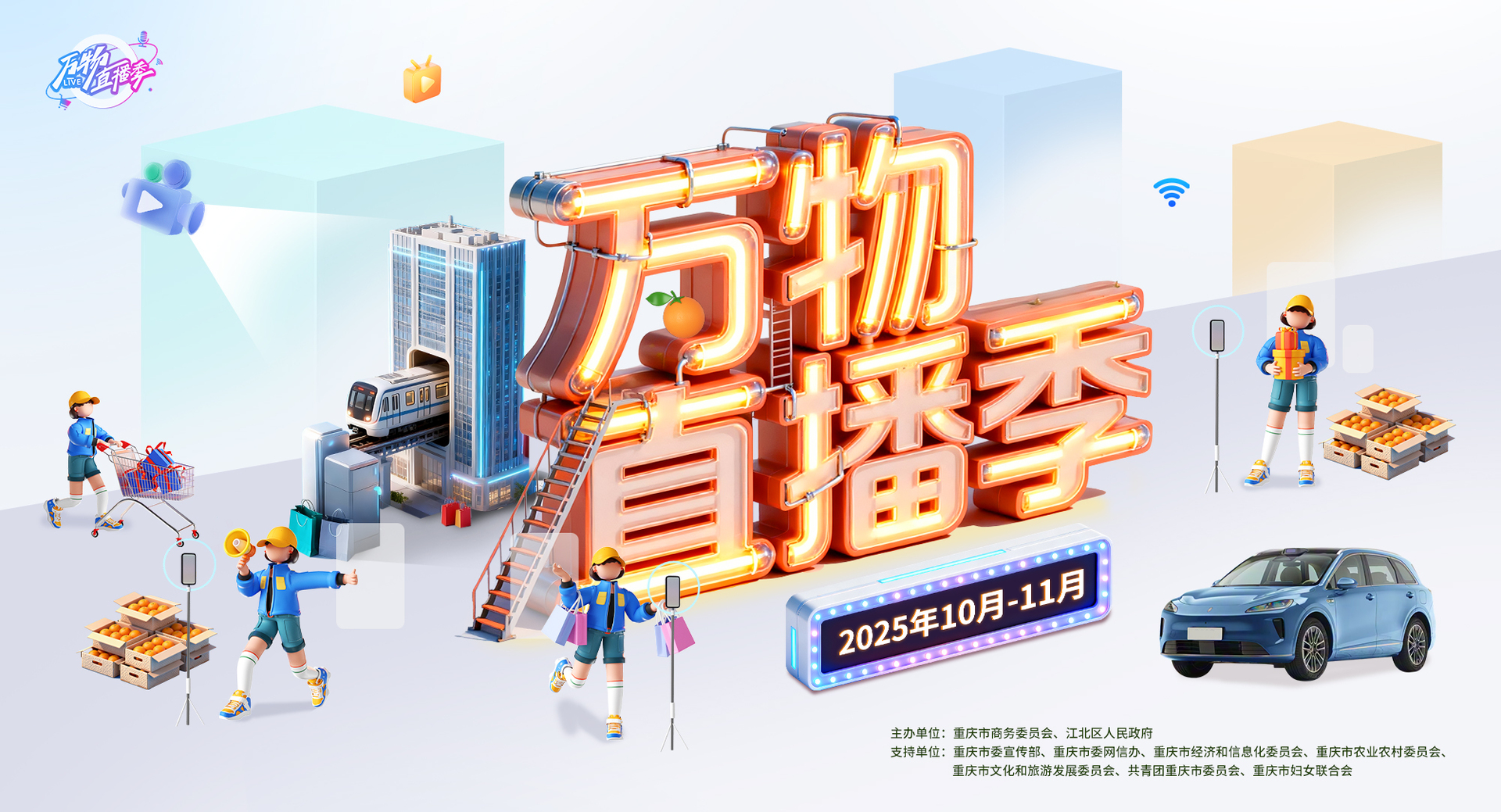 “2025爱尚重庆·万物直播季”启动仪式暨“山城烟火·万物直播盛典”定于10月23日19:00在江北嘴钻石广场举行。活动由江北区商务委员会、腾讯西南总部与重庆卫视联合呈现,创新融合“烟火集市+无人机实景+全民直播+综艺带货”等多元形式,打造沉浸式消费新场景,进一步彰显重庆城市魅力。