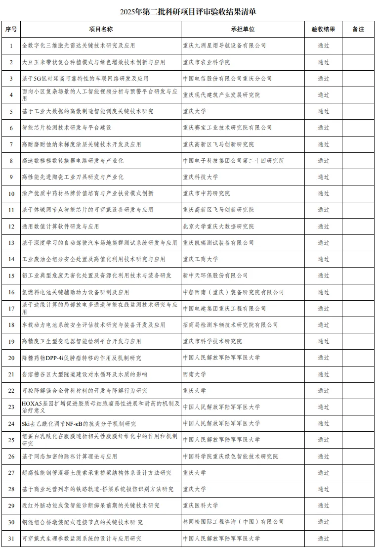 按照重庆市科研项目相关管理规定,市科学技术局委托第三方管理机构组织科研项目评审验收。现对近期验收的科研项目进行公示(详见附件),公示时间为2025年11月19日至11月25日。