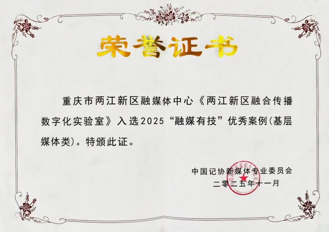 11月21日,记者从两江新区获悉,近日,由中央宣传部指导,中华全国新闻工作者协会、湖南省人民政府联合主办的2025中国新媒体大会在湖南长沙举行。会上,两江新区融媒体中心报送的《两江新区融合传播数字化实验室》获“融媒有技”优秀案例(基层媒体类),入选全国地方融媒体中心十大优秀案例,也是全市唯一获奖的案例。